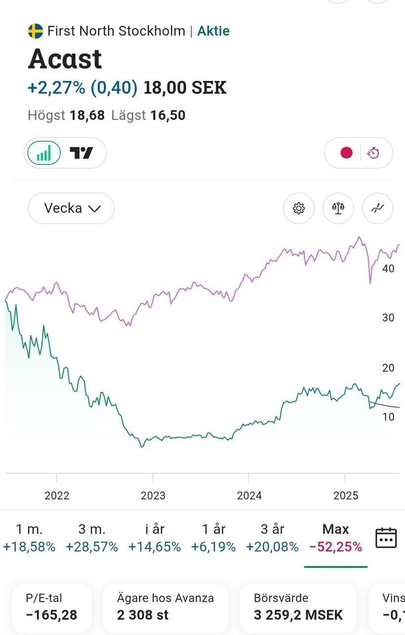Acasts aktie har en beta på 0,60, vilket indikerar lägre volatilitet än marknaden, men är ändå föremål för prissvängningar (52-veckorsintervall: 12,50–21,60 SEK).