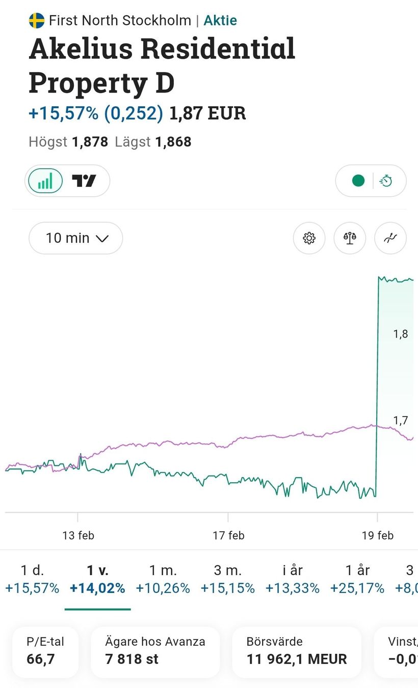 Akelius Foundation lägger (via dotterbolag) ett offentligt uppköpserbjudande av aktierna på 1,9 Euro per D-aktie vilket innebär en premie med ca 17% jämfört med gårdagens stängningskurs på 1,618 Euro. Snyggt av Roger skulle jag säga då han redan kontrollerar 90% av bolaget och hade kunnat köpa ut till lägre pris om han velat.
