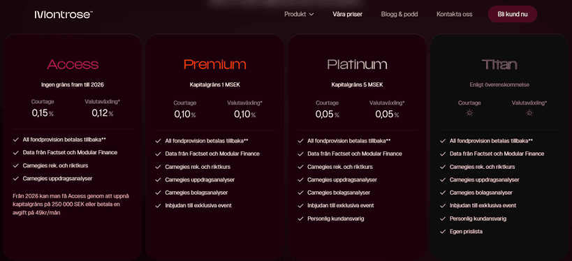 Vi har testat Montrose och satt in lite pengar på konton där för att utvärdera plattformen och kommer fortsätta uppdatera om den här på bloggen. Mer om utvärderingen och jämförelse med andra nätmäklare hittar ni längst ner i inlägget. Vad som kan vara värt att nämna är att Montrose tar en liten avgift för att ha depå hos dem om man har mindre än 250.000 kr på depån. De siktar tydligt på de kunder som har kommit lite längre i sin sparresa än den absoluta nybörjaren.