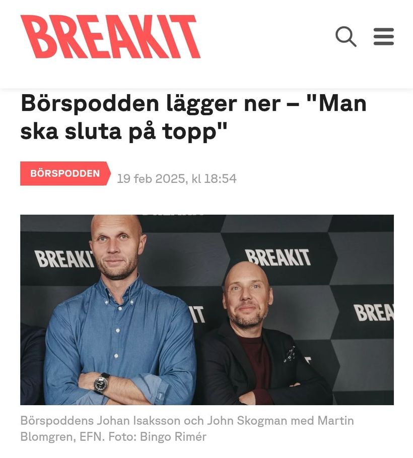 Ikväll läser vi på Breakit att Börspodden lägger ner efter sitt 600:e avsnitt som sändes idag. Det känns som att risken finns att detta är ett beslut som kan komma att ändras eller att det är nån sorts skämt men en liten bomb i finansankdammen är det allt.