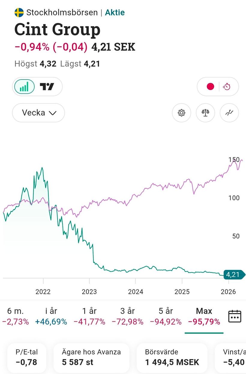 Cint noterades så sent som 2021 till kursen 72 SEK och utvecklingen sen dess är -95,79% innan budet.