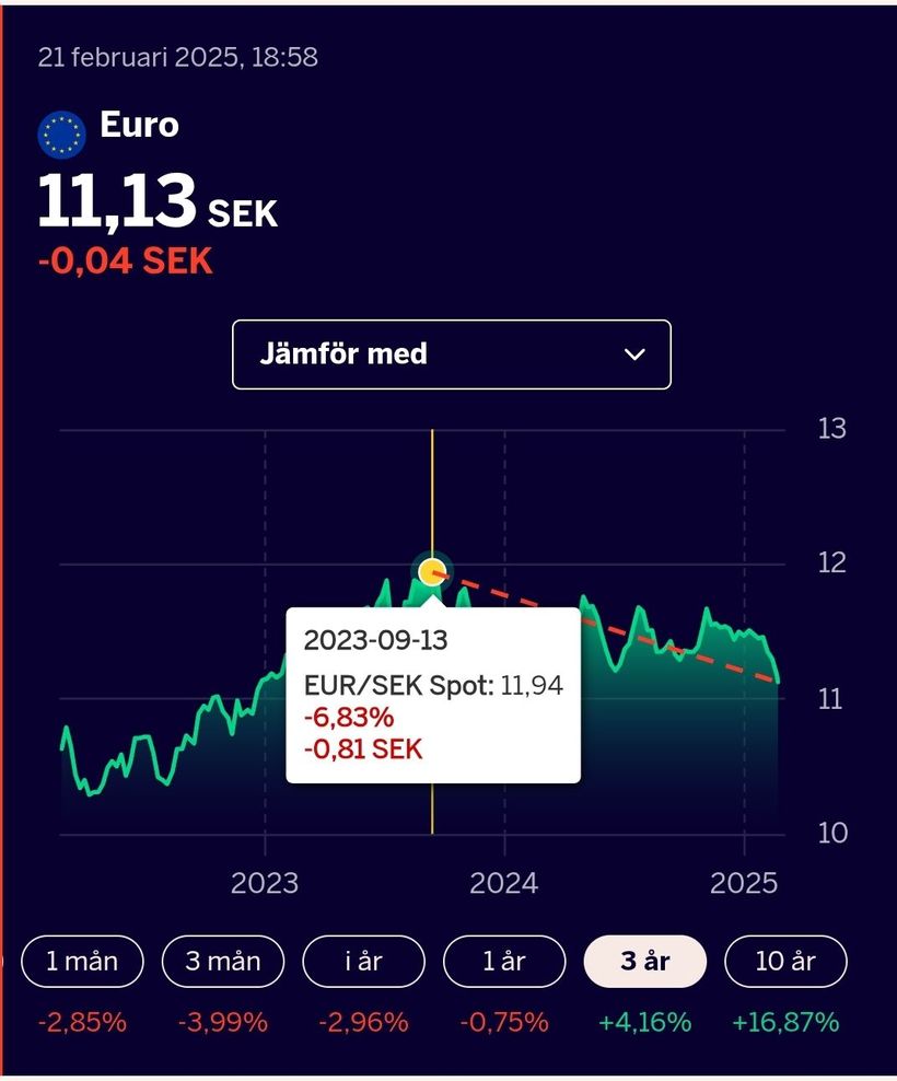 För första gången på länge stärks Svenska kronan mot euron och idag kostar en euro 11,16 kr. Det är en rejäl nedgång sen sommaren 2023 då euron kostade 12 kr. Skönt för alla semestrande svenskar och för alla som köper in varor i euro.