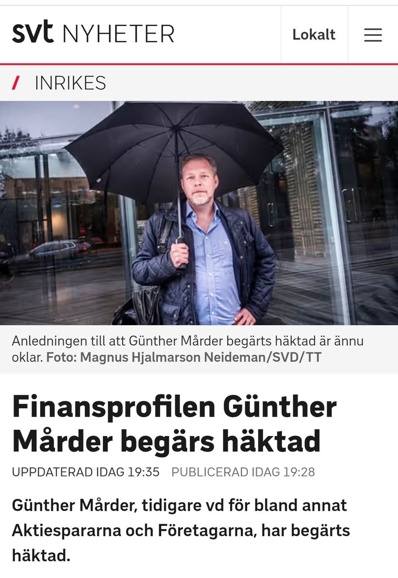 Ikväll nås vi av nyheter om att sparprofilen Günther Mårder begärts häktad. Spotlight Group, där Günther sitter i styrelsen, meddelar att de inte vet vad orsaken till häktningen är men att de inte har några indikationer på att det skulle röra dem. Jag måste säga att jag är extremt överraskad över detta och jag både hoppas och tror att Günther är oskyldig och släpps snart.