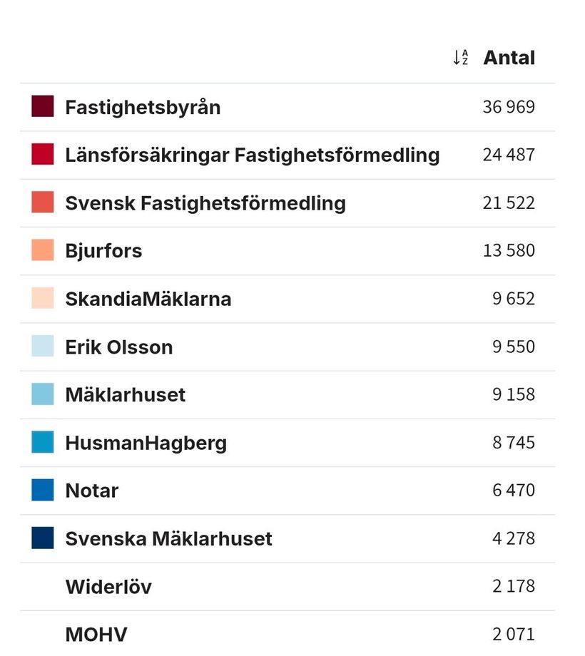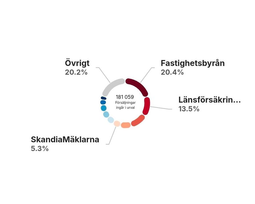 Först kollar vi på hur branschen ser ut: Swedbanks mäklarfirma Fastighetsbyrån är störst (1) Länsförsäkringar (2),