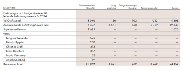 Förra året var den totala ersättningen till de 7 ledningspersonerna 24 mkr, alltså 3% av omsättningen, 15% av personalkostnaderna eller 3,5 mkr per person. Det här är ett generöst arvode, särskilt med tanke på att ledningen i genomsnitt äger aktier för 0,04 årslöner. Däremot är både kompensationen och aktieägandet i styrelsen mer plausibelt med Magnus Welander och Henrik Nyqvist i spetsen.