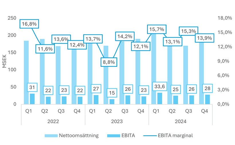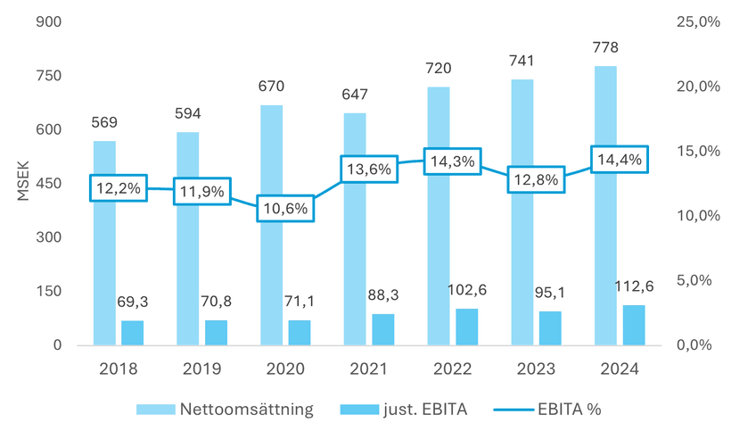 2024 var något av ett återhämtningsår med 5% försäljningsökning efter 2 år av negativ organisk tillväxt på grund av en dämpad renoveringsmarknad. Det är tydligt att Embellence har en konjunkturell risk. Trots det bibehölls EBITA-marginalen mellan 12-15% på årsbasis och trendar numera uppåt.