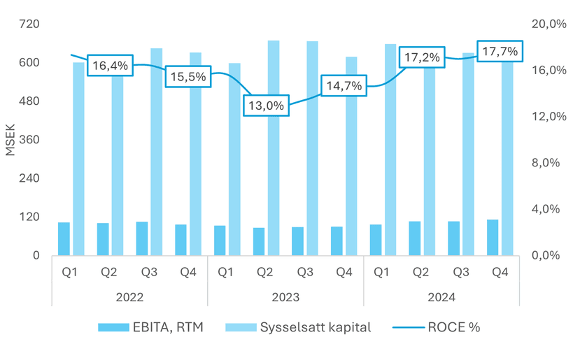 Att äga produktionen möjliggör högre marginaler samtidigt som det ökar kapitalintensiteten. Kapitalförräntningen uttryckt i ROCE har placerat sig runt 13–18% de senaste åren. 2024 bantades nettoskulden rejält till 0,3x EBITA vilket gav medvind till nyckeltalet.