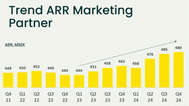 Marketing partners är det mer attraktiva affärsområdet som fokuserar på B2B digital marknadsföring. Kunderbjudanden innefattar till exempel SEO-optimering, byggande av webbsidor, förbättrade kampanjer och annonsering på Eniros plattformar. Kunderna faktureras i huvudsak genom en prenumerationsmodell. ARR (årliga återkommande intäkter) uppgick vid årets slut till 489 mkr, +6% jämfört med 2023. Marketing Partners är riktigt lönsamt med en EBITDA-marginal på 25%.