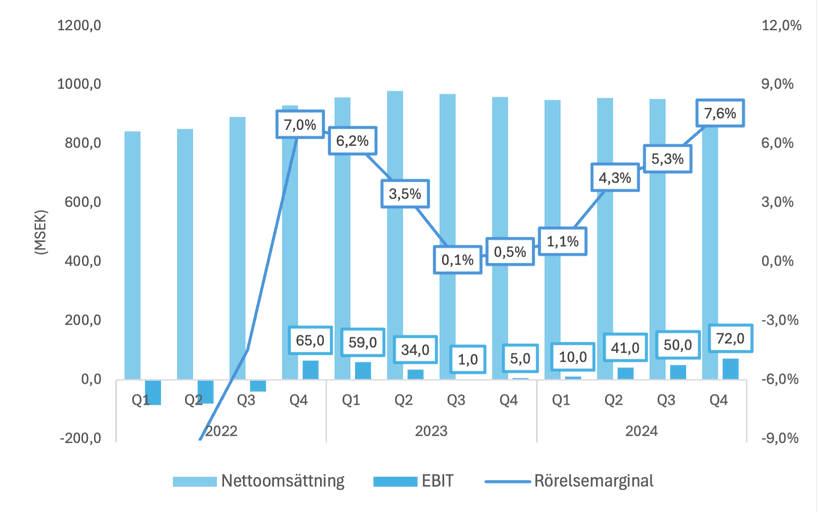 Under det gångna året har disciplinerade och mycket framgångsrika effektiviseringar implementerats i organisationen. Arbetsstyrkan har förvisso minskat med några procent, men det verkliga kostnadsbesparandet har realiserats med hjälp av AI. Hosni nämnde under presentationen av Q4:an att arbete som tidigare tog flera dagar nu kan färdigställas på några sekunder genom AI-applikationer. Under 2024 minskade ”Övriga externa kostnader” med 26%.