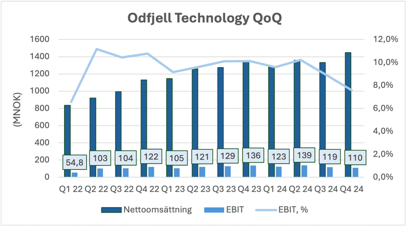 Omsättningen uppgick till 1450 MNOK, en ökning med +8% jämfört med Q4 2023. Detta är den högsta omsättningen i Odfjells historia i ett enskilt kvartal. Lönsamheten hängde dock inte med; EBITDA och EBIT minskar med 15% respektive 20% YoY. För Q4 ska 60 MNOK delas ut, vilket för helåret ger en direktavkastning på 13%. Ledningen förväntar sig marknadsförbättringar i Q3 2025.