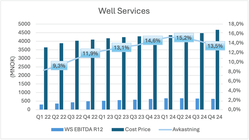 Sätter man EBITDA resultatet från Well services i relation till det ackumulerade anskaffningsvärdet av utrustningen uppgår det till 13,5%. En fortsatt uppsida i caset är om avkastningen på Well Service utrustningen kan återgå till nivåer under det tidiga 2010-talet runt 25%.