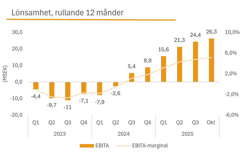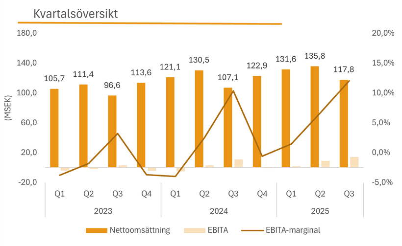 Skuldsättningen har länge varit hög på grund av expansionen som genomfördes 2019-2023. Tack vare förbättrad operativ utveckling har den dock bantats rejält 2025 och uppgår till 1,7x EBITDA. Q3 är dock svagt avseende likviditeten på grund av rejäl kapitalbindning som frigörs i Q4.