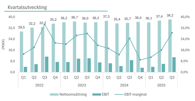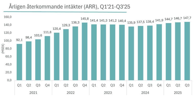 I Q3 saktade dock ARR-tillväxten in, med en nettoaddering på 1 MSEK jämfört med 2-3 MSEK de föregående kvartalen. Jag tror inte att man ska fästa för mycket vikt på detta eftersom det förmodligen beror på säsongseffekter. Under semestermånaderna är det få företag som vill implementera ett nytt CRM-system och skjuter istället på det till efter semestern. Därmed är sannolikheten stor att ARR-tillväxten accelererar i Q4. I början av 2026 ges en ARR-uppdatering för Q4, vilket kan utgöra en trigger för aktien.