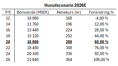 Givet den historiska värderingen om P/E 20x, att peers värderas högre, stabiliteten i affären samt framtidsutsikterna anser jag att en högre värdering är motiverad. Ponerar vi att värderingen återgår till det historiska snittet 2026E uppgår uppsidan till ca 60%.