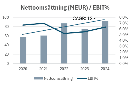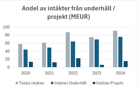 - Underhåll: Cirka 80% av intäkterna kommer från underhållsverksamheten. Bland kunderna finns Stora Enso, Hamina LNG, Gasgrid och Raisio som sammantaget är stabila bolag. Underhållsavtalens längd är inte specificerade, men intäkternas stabilitet tyder på en branschstandard om 5–10 år. Viafin har inte gått ut med hur stor kundkoncentrationen är. Jag skulle gissa på att det finns 3-4 kunder inom underhåll som står för majoriteten av EBIT, vilket såklart är en hög kundkoncentration. Om man tittar på affärsområdets tillväxt de senaste fem åren, ser det däremot tryggt ut med inga större kundtapp.
