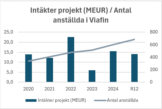 - Viafin har ökat personalstyrkan med 50 % sedan 2020, vilket både stärker basen för stabila underhållsavtal och ger flexibilitet att skala upp projektverksamheten. Även om inte alla nya anställda jobbar direkt i projekt, så innebär större kapacitet och bredare kompetens att bolaget har helt andra möjligheter att ta sig an fler projekt än för fem år sedan. Grafen nedan visar korrelationen mellan att fler projekt leder till högre EBIT- marginal för koncernen som helhet.