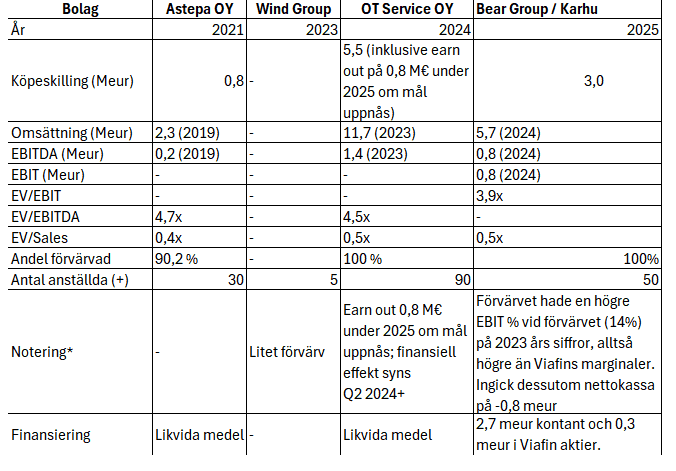 - Det senaste förvärvet av Bear Group / Karhu ser prisvärt ut, men det finns lite orosmoln. Innan affären tappade Bear/Karhu Group en stor kund strax innan affären, då kunden haft finansiella problem och inte betalat sina fordringar. Om Viafin lyckas hitta nya kunder år Karhu/Bear ser dock affären prisvärd ut med ett pris på EV/EBIT 3,9x. Karhu Groups EBIT-marginal 2024 var imponerande 14 procent (vilket jag tror är lite dopade) och affären inkluderade en nettokassa på -0,8 meur. Ett billigt pris och nettokassa ger stabilitet och minskar risken för att affären blir negativ på sikt. Jag kommer dock bevaka noga hur förvärvet utvecklar sig framöver. Nedan ser man Viafins förvärvshistorik senaste åren.