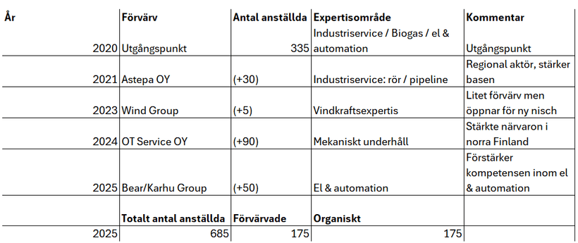 - Breddad kompetens: Genom förvärven som visas nedan har Viafin breddat sin kompetens avsevärt sedan 2020, vilket ökar möjligheten att ta sig an fler projekt med högre marginaler. Samtidigt sprids risken i projektverksamheten genom att bolaget besitter kärnkompetensen som krävs för att vinna och leverera även större projekt.