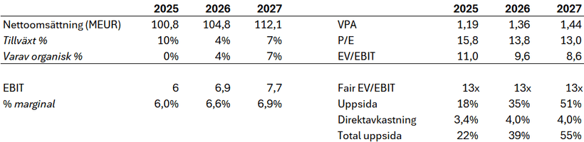 - Slutsats: I takt med att den finska lågkonjunkturen lättar förväntar jag mig ökad investeringsvilja, vilket bör driva fler projekt framöver. Viafin är nu ett större bolag med bredare kompetens och ett större kontaktnät, vilket gör dem väl positionerade att ta del av denna uppgång. Mot bakgrund av historisk leveranskapacitet och kompetens i ledningen ser jag att andelen projekt mot 2026–2027 sannolikt blir högre än 2025, vilket bör bidra till ökade marginaler för koncernen som helhet.