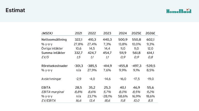 I mina estimat har jag utgått från en årlig organisk tillväxt på 10 % inom Hemstäd, i linje med den genomsnittliga tillväxten på RUT-marknaden under de senaste tio åren. Utöver detta adderar de två senaste förvärven cirka 6,2 MSEK till helårsomsättningen under 2025. För affärsområdet Företagsstäd räknar jag med en tillväxttakt på 5,0 % för 2025 och 7,5 % för 2026. Notera att estimaten är exklusive ytterligare förvärv och att det således finns en fin potentiell uppsida om HomeMaid fortsätter att vara aktiva på förvärvssidan.