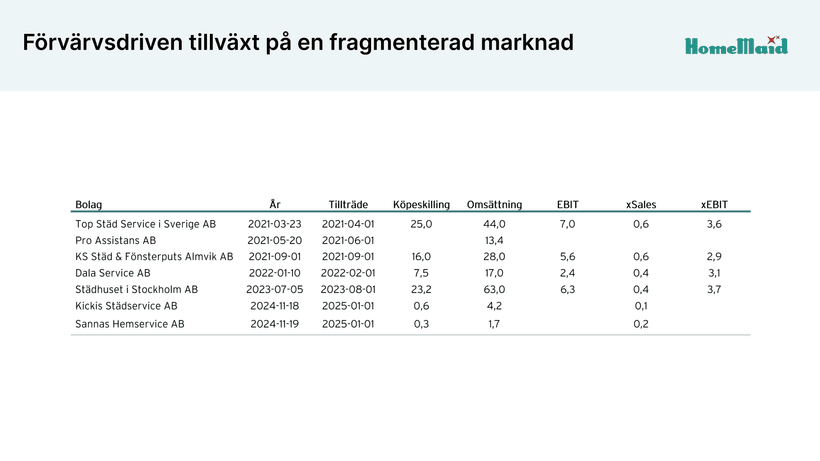 Sedan 2021 har HomeMaid genomfört flera förvärv inom båda affärsområdena, där bolagen har förvärvats till förhållandevis låga värderingsmultiplar.