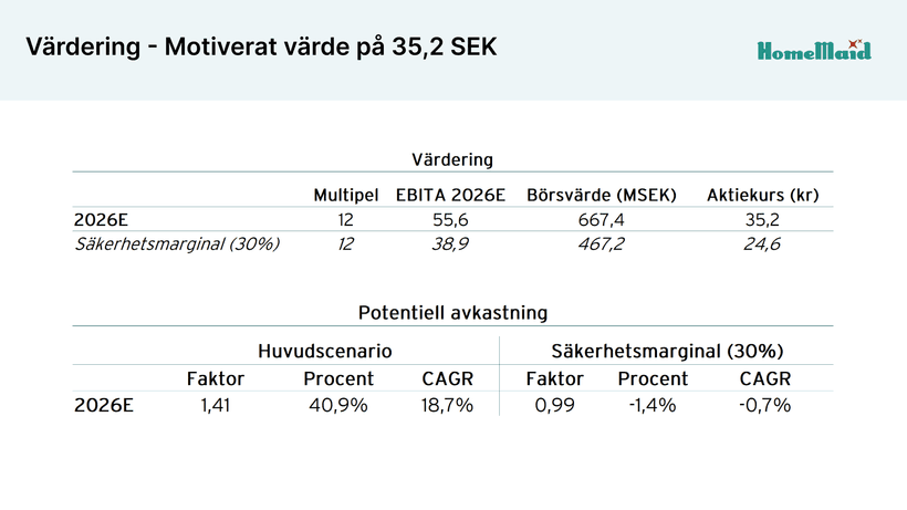 Den starka balansräkningen och kassagenereringen skapar utrymme för både utdelningar och fortsatt förvärvsdriven expansion. Baserat på nuvarande EBITA-nivå och en utdelning om 1,25 SEK per aktie har HomeMaid möjlighet att genomföra förvärv i storleksordningen 60 MSEK, under förutsättning att nettoskulden inte överstiger 2x EBITA. HomeMaid är väldigt noggranna med vilka typer av förvärv de vill göra och under dessa förutsättningar har de möjlighet att göra de förvärv de vill. Sammantaget har HomeMaid en finansiell stabilitet och flexibilitet som jag tycker är särskilt attraktiv i en bransch där konsolideringsmöjligheterna är goda.