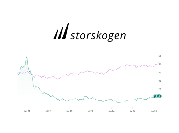 När bolaget noterades 2021 var historien en annan. Under 2021 och 2022 gjorde Storskogen förvärv i ett högt tempo. Totalt förvärvades 99 bolag under två år. Bolaget värderades också högt med ett P/E-tal på 45. När sedan möjligheten till billig finansiering försvann med högre räntor och konjunkturen vände ner, fick Storskogen snabbt problem. Den organiska tillväxten vände ner, bolaget fick svårt att försvara sina marginaler, samtidigt som resultatet belastades med höga räntekostnader. Aktiekursen gick från 60 SEK till 5 SEK.