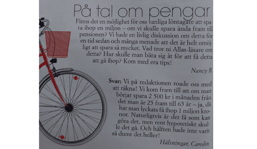 Kommer ni ihåg för några år sedan när tidningen Allas hade fått en läsarfråga om ifall det skulle gå att spara ihop en miljon på en vanlig lön? Så här såg det ut: