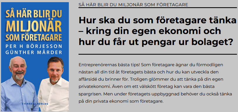 Jag har läst en relativt nyutkommen bok som jag tänkte tipsa om. Boken heter "Så här blir du miljonär som företagare" och är skriven av de kända ekonomiprofilerna Per H Börjesson och Günther Mårder.