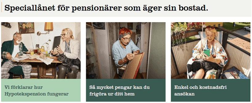 Svensk Hypotekspension vänder sig till personer över 60 år med lågt eller obelånat boende. Det rör sig inte om ett bolån, utan något som heter kapitalfrigöringskredit. Du betalar ingen ränta eller amortering på lånet utan räntan läggs på det lånade beloppet och tas ut först när du säljer bostaden eller dör. Då räntan är hög, över 8%, och ingen ränta eller amortering görs löpande växer lånet snabbt i storlek. Enligt deras egna exempel som är tydliga på hemsidan dubblas lånet i storlek var 10e år med dagens ränta. Vilket i sin tur gör att man måste vara rätt gammal för att få låna en större del av bostadens värde.