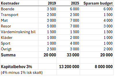 Det betyder att vi skulle behöva ett kapital på 13,2 miljoner för att kunna leva på dagens nivå och skulle klara oss på ett kapital på 8 miljoner med en mer återhållsam budget med 4% uttag innan isk-skatt.