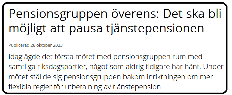 Idag kom en nyhet från Regeringens pensionsgrupp att de ställer sig bakom ett förslag på att man ska kunna pausa sitt uttag av tjänstepension. Läs mer om nyheten här på Regeringens hemsida.