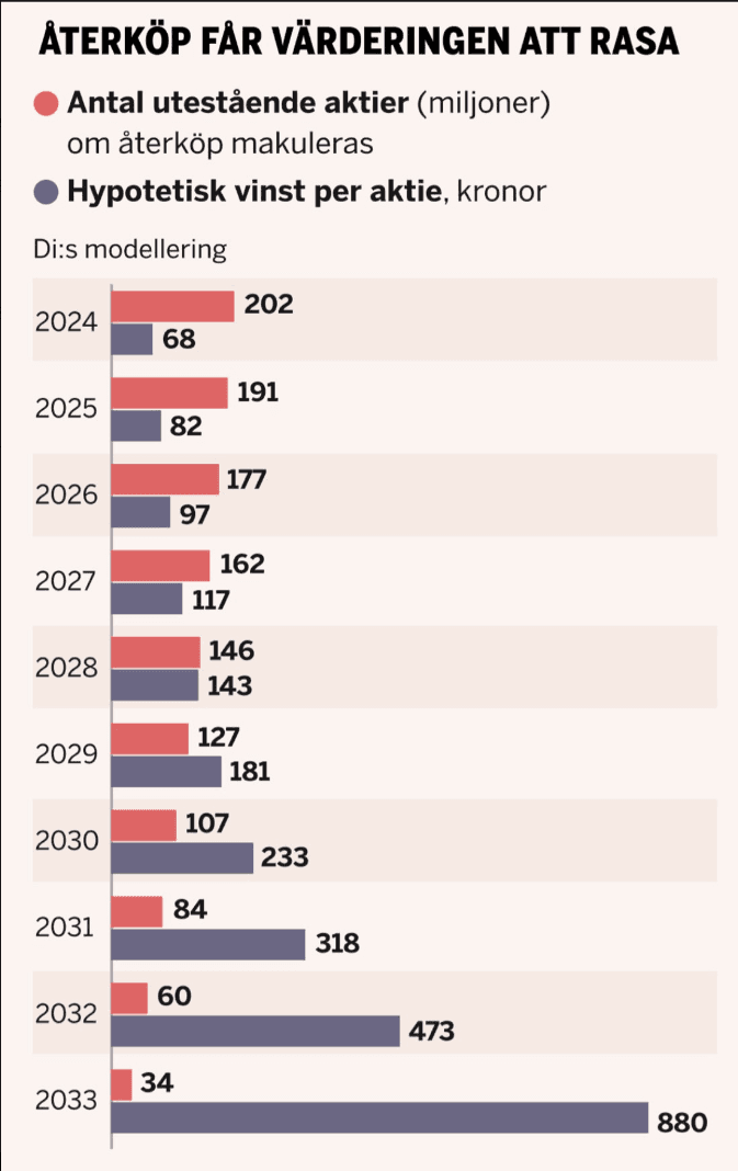 Di-artikeln tyckte jag var rätt märklig i sin uträkning som landade i mer än 10-dubblad aktiekurs på 10 år. Den byggde visserligen på rätt försiktiga antaganden om tillväxt och vinstmarginal. Men nästan hela vinsten användes i exemplet till återköp och uträkningen baserades på en kurs strax under dagens. I alla 10 år. Dvs totala vinsten ökar lite år för år. Denna vinst används till att återköpa aktier år för år. Varje år blir vinsten alltså lite större och ska delas upp på lite färre aktier. Men aktien ligger i DIs uträkning still i pris vilket gör att det blir en ränta på räntaeffekt där antalet aktier minskar i allt högre takt, totalt skulle 84% av det totala antalet aktier återköpas och makuleras i exemplet. Utan att priset går upp.