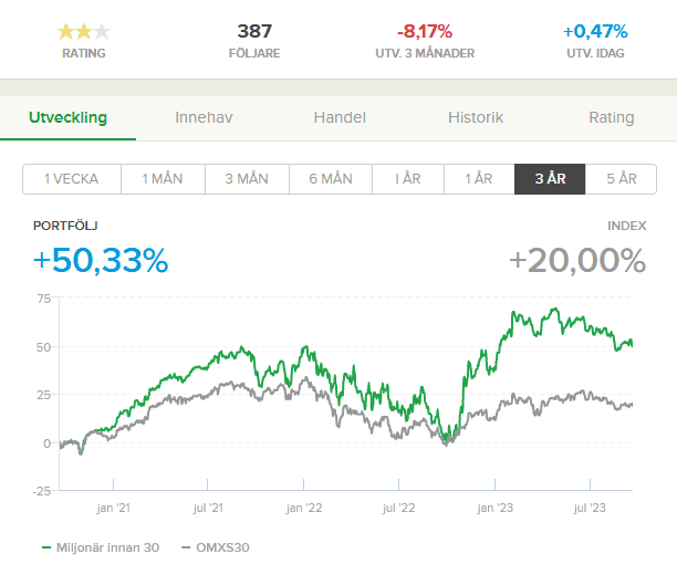 Portföljen är koncentrerad och svängningarna jämfört med index blir stora. Portföljen går att följa via Shareville och den blir som en rolig tävling mot mig själv, samtidigt som den gör att det blir ännu lättare att vara passiv och följa index i övriga investeringar.