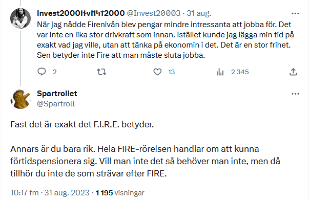 Kul med stort engagemang kring inlägget om FIRE-paradoxen. Jag fick rätt mycket kommentarer på Twitter och några mail och kommentarer här på bloggen.