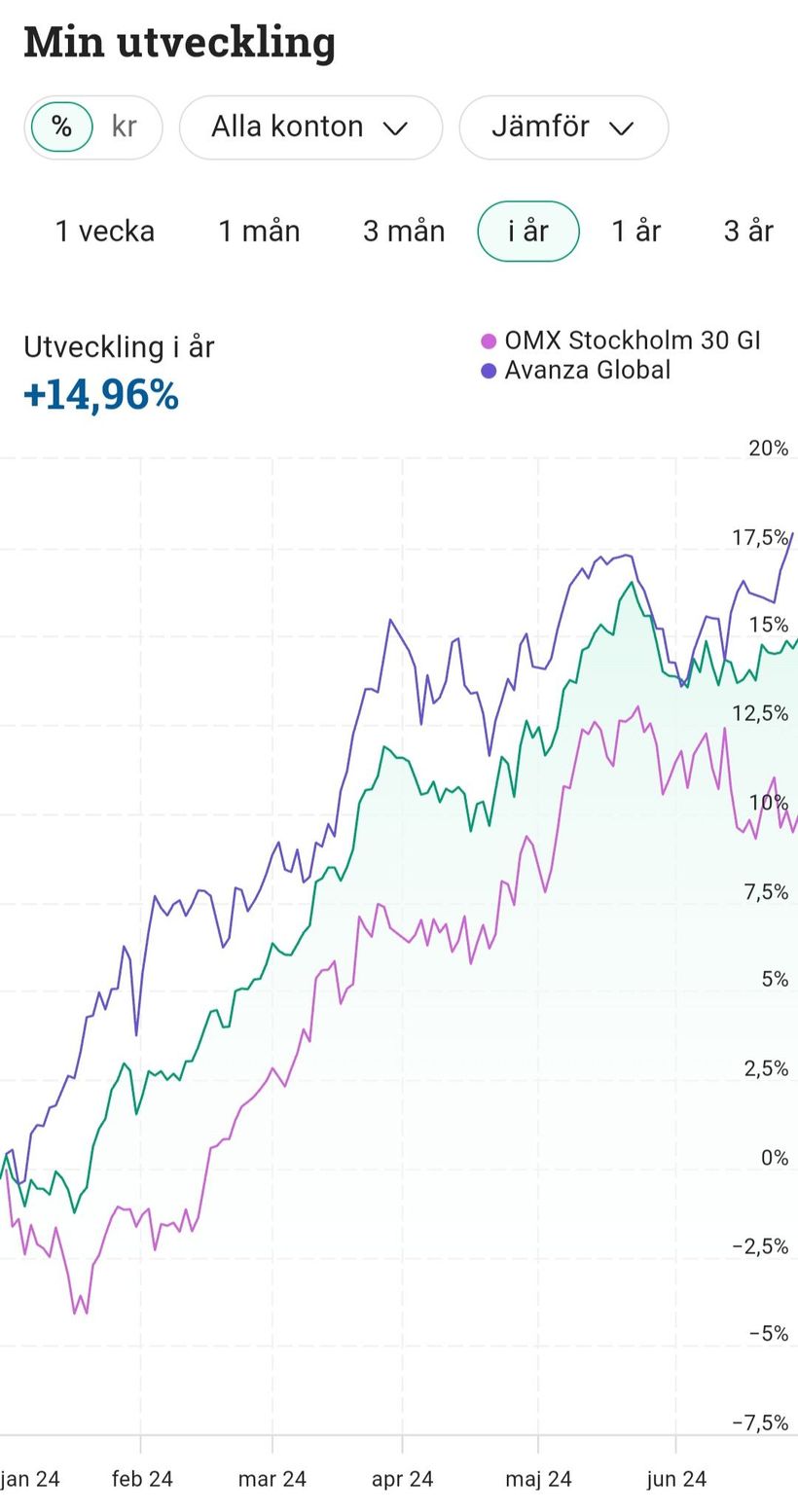 I min lilla pensionsportfölj (ca 5% av totalen) får jag utlopp för mitt aktieintresse och där finns det väldigt svag koppling mellan mitt resultat och något index. Utan där kan det gå lite hur som helst. I höstas hade jag under några månader det mesta av pengarna i en fastighetsfond och nu ligger över 50% av pengarna i ett enskilt bolag i form av Evolution. Mina ansträngningar i form av att köpa och sälja aktier och vikta enskilda bolag tungt har inte betalat sig under första halvan av 2024. Portföljen är bara upp 7,62% och har alltså gått mycket sämre än stora passiva huvudportföljen. Men det är nog bara bra att få en påminnelse om att index och passivitet är rätt för huvudportföljen efter flera år där den lilla aktiva portföljen gått bättre än den stora passiva.
