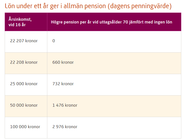 Tror ni alla 16-åringar där ute skakar av engagemang när de tänker på att de genom att jobba halva sommarlovet och betala skatt kan få 61 kr i månaden om 54 år?