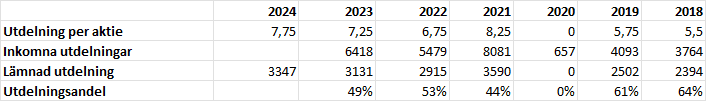 Nu kan man alltid leka lite med siffrorna. Är det 2023 års inkomna utdelningar som nu skickas ut till oss ägare? Det vill säga om Volvo delar ut mer i år, ska vi som äger Industrivärden hoppas på att få dessa pengar först nästa år? Men över tid blir det en lek med siffror vilken krona som hör till vilket år. Så här redovisar Industrivärden själva inkomna och utlämnade utdelningar över åren.
