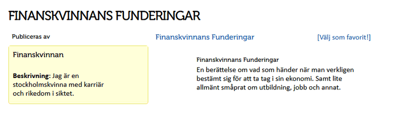Bloggen blev snabbt stor och Finanskvinnan var med både i Dagens Industri och Avanzas genomgång av intressanta bloggar. Sen helt plötsligt 2016 var det slutbloggat och Finanskvinnan försvann helt från “rampljuset”. Vi läsare fick en vag bild av att det skulle köpas hus och bildas familj och sen var det tack och hej.