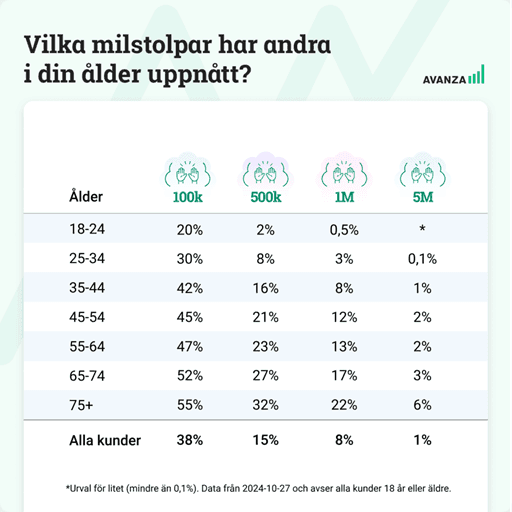 Men det här behovet av att jämföra med andra verkar stort. Avanza publicerade nyligen ett blogginlägg där man kunde se hur många procent av kunderna i en viss ålder som uppnått en viss storlek på portföljen. Här kan du läsa det inlägget.