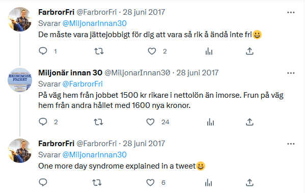 Det blev alltså ungefär 13 års heltidsarbete för min del. Och jämfört med den "normala" längden på ett yrkesliv på 40-45 år så är det så klart lite konstigt att sitta och fundera på om 13 år var onödigt mycket. Men hela grejen med FIRE är ju att gå utanför vad som anses vara det normala och vända och vrida på varje sten.