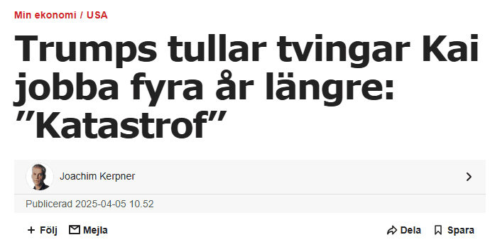 Här handlar det om en 63 årig egenföretagare som redan ett par dagar in i börsnedgången kopplat till tullarna hade lyckats räkna ut att effekten skulle bli att han behövde jobba 4 år längre än vad han hade planerat. Hur tusan den uträkningen ser ut skulle jag vilja läsa mer om.