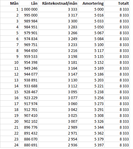 Tanken är alltså att man räknar ihop kostnaden för ränta och amortering månad ett. Och sen när lånet minskar i storlek så kommer amorteringen kunna bli lite större om man lägger en fast totalsumma på ränta och amortering varje månad. Nu är det här räknat på en ränta på 4% och utan ränteavdrag, så den egentliga effekten ska nog egentligen vara något mindre om man räknar in avdraget. Men för motivationens skulle tog jag mig vissa friheter.