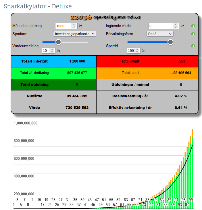 “Det var lite segt de första 75-80 åren, men sen tickade det på rätt bra efter det” (bild skapad med Stefan Thelenius kalkylator)