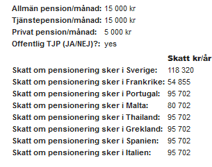 När jag testade kalkylatorn på Sparsam Skatt så såg det ut så här för en person som har 35 000 kr i månaden i pension. Dessa siffror gäller alltså 2023 och omfattar inte den kommande förändringen i Portugal.