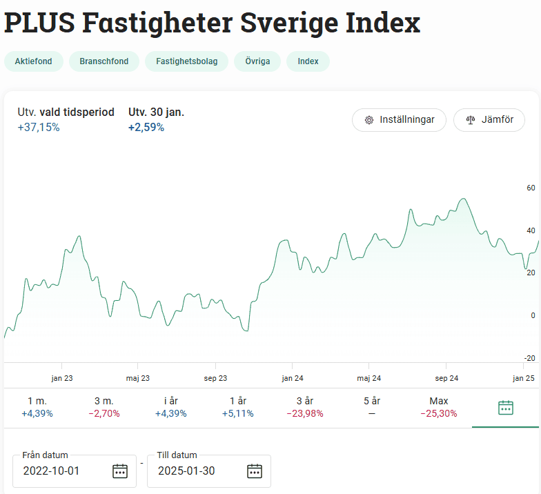 Fonden har sedan dess gått upp med 37%. Dvs det krävs en rätt stor nedgång kommande halvår för att Roger ska få rätt med billigare aktier 1 oktober 2025 än 1 oktober 2022. Men till hans försvar ska sägas att storbolagsindex i Stockholm (tex Avanza Zero) har gått upp 55% sedan samma datum. Så till viss del får vi kanske ge honom rätt att fastigheter har haft det fortsatt tungt även efter den kraftiga nedgång i aktiekurserna som kom i samband med de första räntehöjningarna under 2022.