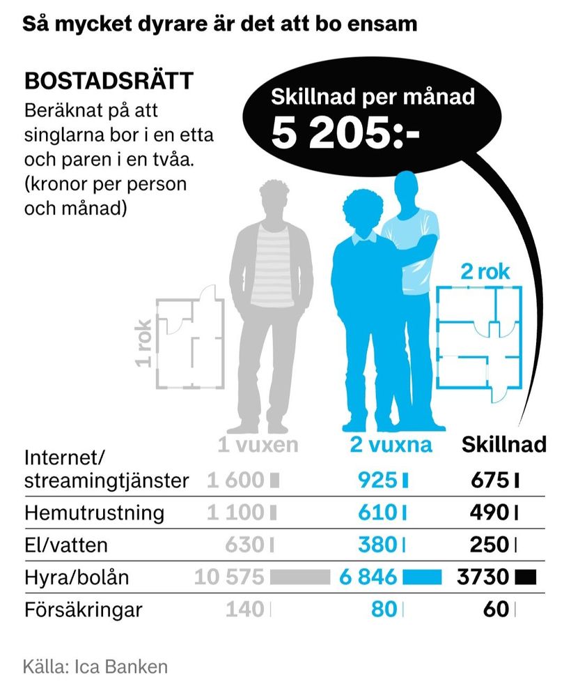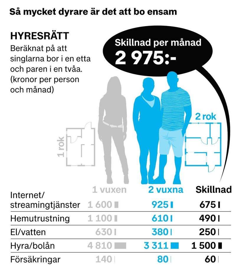 Så som vanligt finns det risk att man missar de verkliga frågorna pga dåliga exempel. För det är helt klart rymligare att bo på 2 personer på 50 kvadrat än 1 person på 25 kvadrat. Om det är så klart billigare att dela på abonnemang och streamingtjänster etc. Dessutom har väldigt många kostnader som tex el, fjärrvärme, vatten etc en hög fast startkostnad som sen påverkas rätt lite av förbrukningen vilket verkligen missgynnar singelhushåll. Det är väl dessutom lite konstigt i tider när minskad förbrukning ska uppmuntras. För det uppmuntrar inte direkt ett sparsamt beteende när man bara får ner kostnaden med en bråkdel av den minskade förbrukningen för den som använder mindre el, vatten eller värme pga av att den höga och fasta startkostnaden inte sänks.