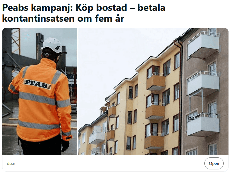 Jag såg att Peab gått ut med ett erbjudande att man i vissa av deras nyproducerade lägenheter kan få skjuta upp kontantinsatsen 5 år. Jag antar att det helt enkelt ska tolkas som att de har lite svårt att sälja vissa lägenheter och istället för att sänka priset tänker att de kan låna ut 15% av köpeskillingen räntefritt några år. Räknar vi med 5 år med 5% ränta på 15% av pengarna blir ingen jätterabatt i rabatt på hela beloppet.