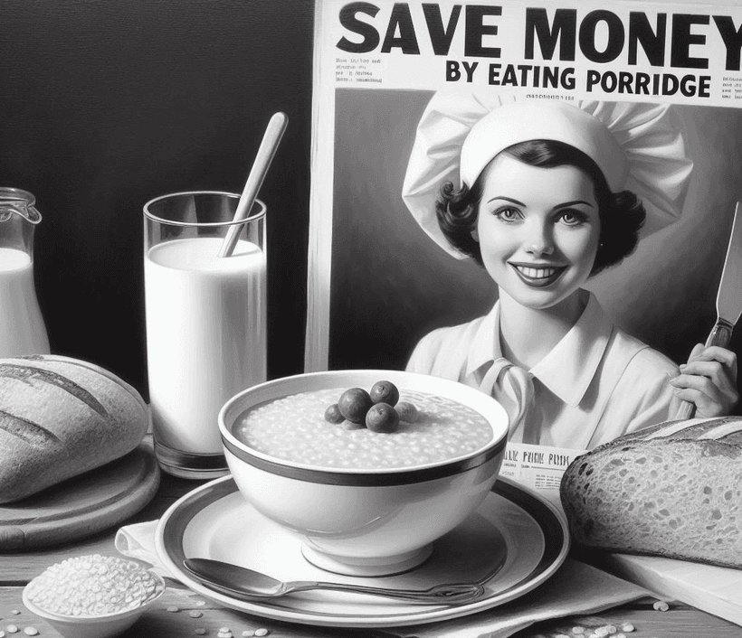 Jag bad Bings AI göra en bild på temat spara pengar genom att äta gröt. Vet inte varför den tolkade det som att året var 1955…