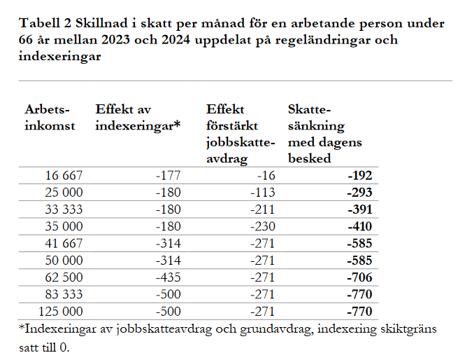 Nästa nyhet på skattefronten blev att ett nytt jobbskatteavdrag infördes. Här sa man sig fokusera på låg- och medelinkomsttagare. Såhär ska det slå ut enligt Regeringens egna siffror.